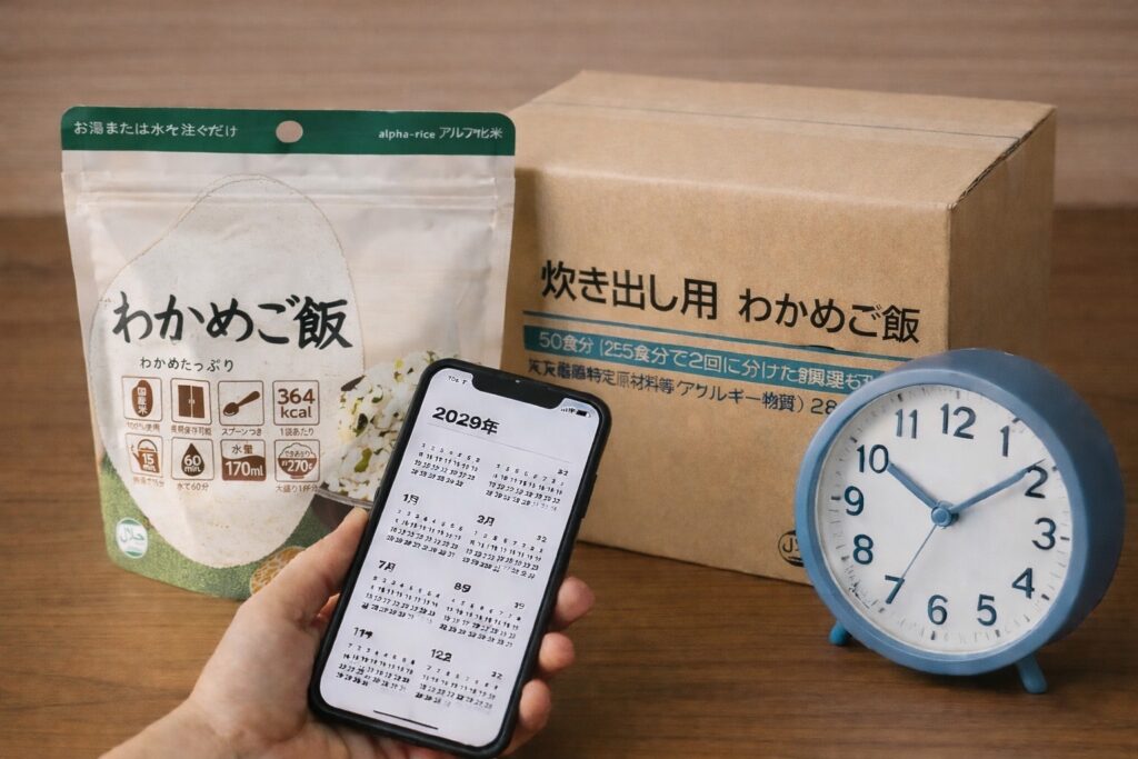 尾西食品やアルファー食品の「安心米」など、主要なメーカーのアルファ米わかめご飯は、製造から5年間の常温保存が可能なものがほとんどです。この「5年」という期間は非常に長いですが、それゆえに「まだ大丈夫」と油断してしまい、気づいた時には期限が切れていたという失敗が後を絶ちません。これを防ぐためには、日常的に食べて買い足す「ローリングストック」を実践するのが理想ですが、5年保存の製品は頻繁に入れ替える必要がないため、管理がおろそかになりがちです。