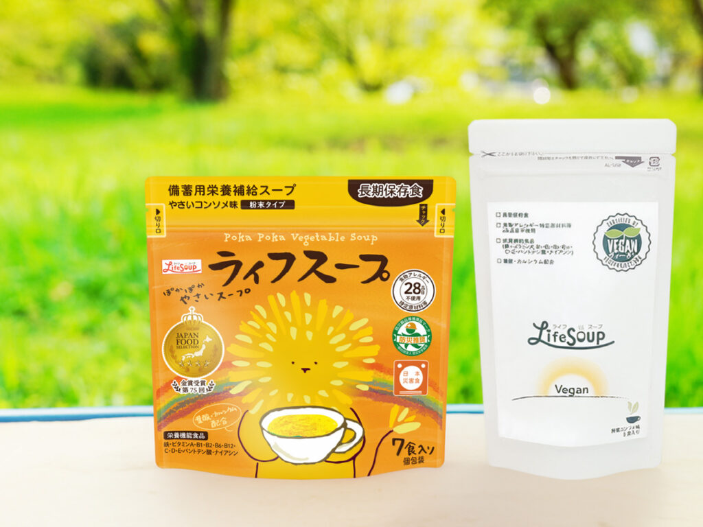 野菜コンソメ味の栄養補給スープ。非常時に不足しがちなビタミン・ミネラルをバランスよく配合し、健康二次被害を予防します。保存期間5年、アレルギー特定原材料28品目不使用、5大添加物不使用。お湯・水で簡単調理。ヴィーガン対応商品もラインナップ。